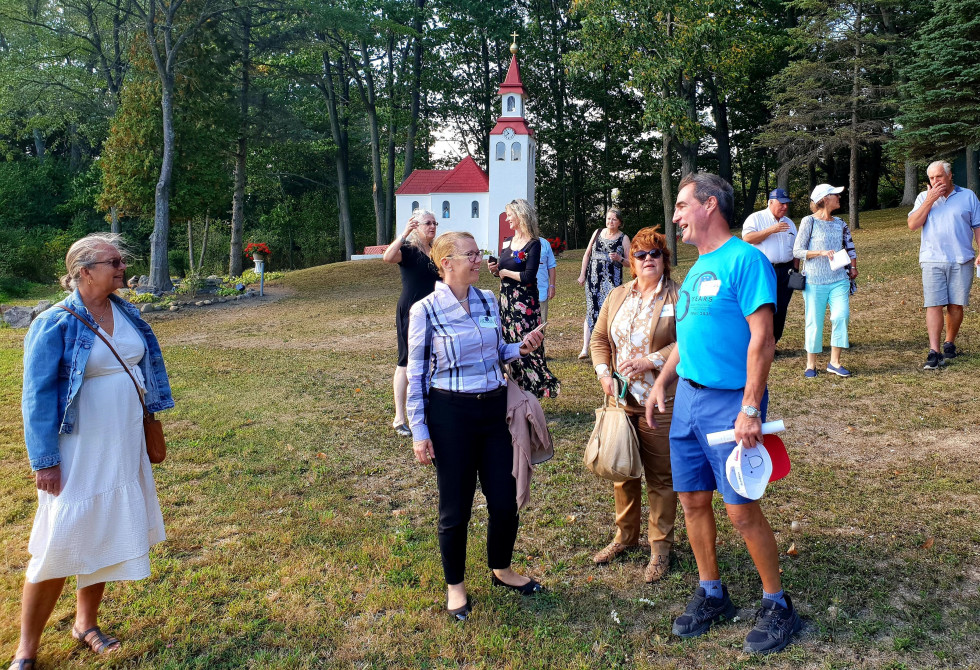 Ministrica, generalna konzulka in rojaki pred cerkvico v parku, foto OSZS			Ministrica, generalna konzulka in rojaki pred cerkvico v parku, foto OSZS