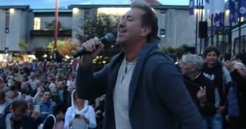 Pevec Werner med protestom proti cepljenju in preverjanju PCT pogojev. (Foto: Posnetek zaslona. Youtube, Topnews, E-maribor)