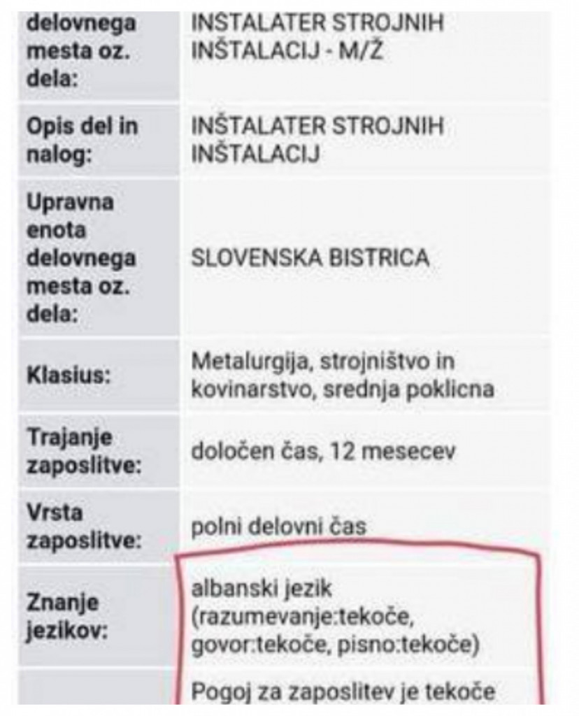 Možno samo v Sloveniji. Ali gre spet za odlično izigravanje slovenske zakonodaje za pridobitev vizumov albanske in kosovske manjšine v Slovenijo ocenite sami. Na spletu se je pojavil oglas za delo inštalaterja strojnih inštalacij, kjer je obvezno treba znati albanski jezik.