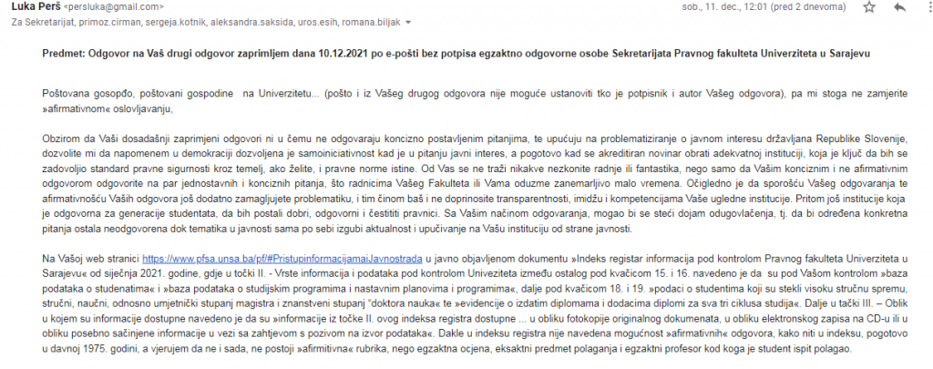 Naš medij je za vikend poslal konkretno elektronsko sporočilo na poslani demanti dekanje PF Sarajevo dr. Zinke Grbo. V daljšem elektronskem sporočilu zahtevali več konkretnih odgovorov. Za razliko od preteklih odgovorov, ko so našemu mediju #Prava poslali takoj naslednji dan, nam do sedaj še niso odgovorili na vprašanje.