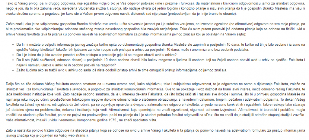 Spoštovana dekanja PF Sarajevo dr. Zinka Grbo, glede na sporno poslano diplomo Branka Masleša lahko tudi kazensko odgovarja za ponareditev uradnega dokumenta.