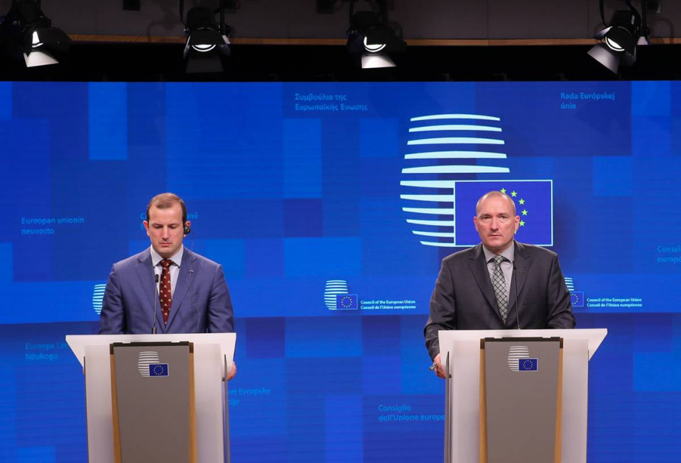 Minister Podgoršek in komisar za ribištvo Sinkevičius na današnji novinarski konferenci | Avtor Council of the European Union