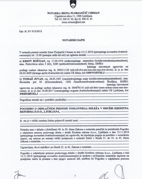 Prof. dr. Aleš Ahčan je dne 12.11.2019 nazaj kupil delež v KREDITNI REFORMI, in sicer v višini 75%, ki so sedaj v lasti Ahčanove mame, ostalih 25% pa je v lasti njegove sedanje partnerice Katje Peček. Iz priloženih prodajnih pogodb je razvidno, da so si vsi udeleženi preprodajali delež v nominalni vrednosti in s tem ni noben ustvaril kapitalskega dobička.