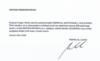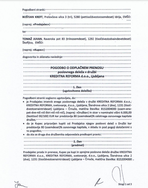 Hkrati plačilo kupnine ni bilo pogoj za prenos deleža v družbi KREDITNA REFORMA. Celotna preprodaja družbe KREDITNA REFORMA na način, kjer se preprodaja samo nominalno vrednost družbe 7.500 EUR, pri čemer pa plačilo le-te ni pogoj za prenos družbe, predstavlja, da je bila preprodaja družbe fiktivne narave, saj ni bila izvedena pod tržnimi pogoji, ki so prof. dr. Alešu Ahčanu, zaposlenemu na Ekonomski fakulteti v Ljubljani, zagotovo znani.