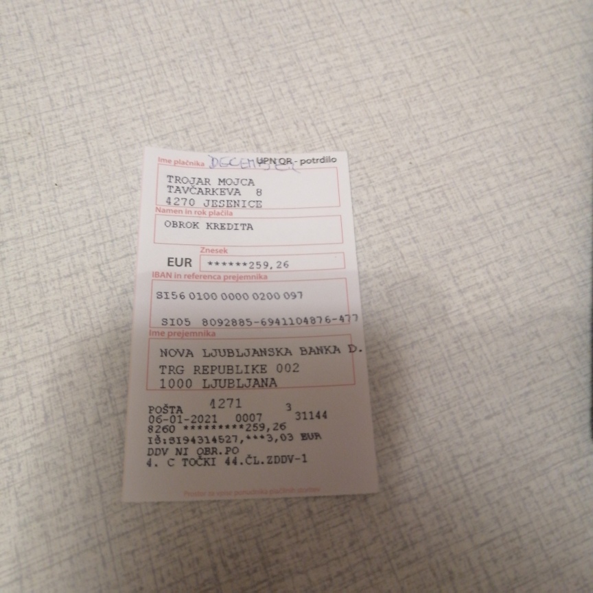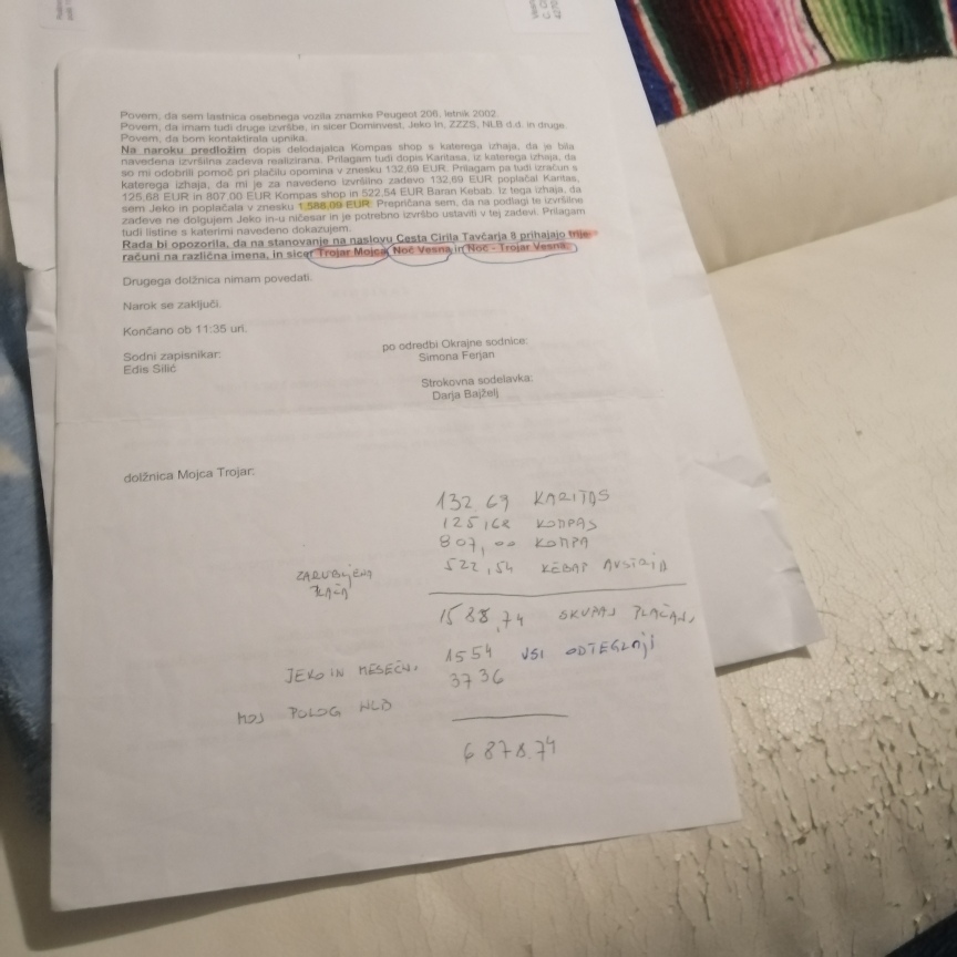 Gospa Vesna Noč je vse finančne obveznosti, ki jih je imela do vseh z zadnjim obrokom decembra 2020 tudi poplačala. To dokazujejo tudi izrezki izpisov plačil. To je zatrdila tudi na sodišču in predložila dokaze, da je vse plačala. Zaradi ropa so njeni hčerki odzveli del plače, da je poplačala dolg. Nočevi se lahko verjame na podlagi dokumentacije, ki jo hrani v svojem stanovanju.