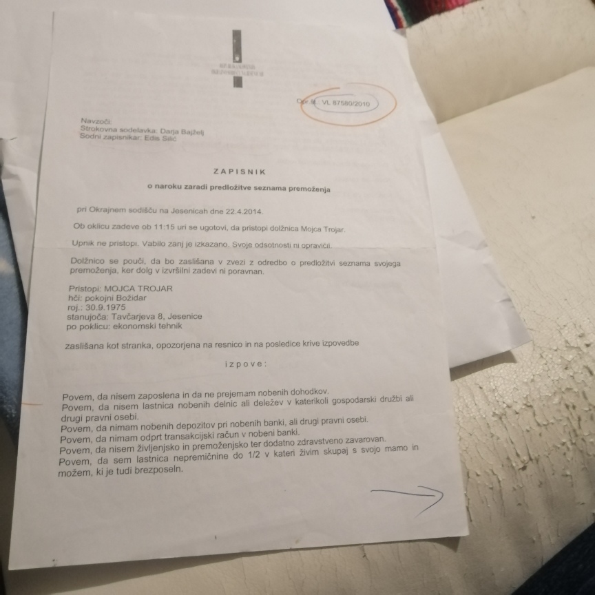 Dve leti so Trojar Mojci ko je bila zaposlena na Jeku vsak mesec trgali od plače, za poplačilo starih dolgov,čeprav jih ni bilo več dosti. Pa vendar pri vsakem odtrgljaju ni nikjer napisano kam se je ta znesek knjižil. Prav zaradi tega je nastal ta dolg v višini 1500 evrov gospe Nočeve do JEKA.