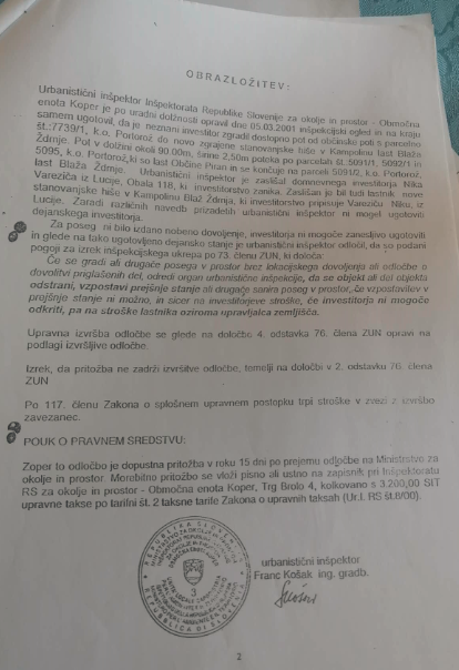 Zaradi pozivov Varezića oblastem glede črno zgrajene poti je koprski inšpektoriat rs za okolje in prostor izdalo odločbo ( št. 356B-53/01-3-FK) za odstranitev dovozne poti. To bi moral Žvrdnja narediti v devetdesetih dneh. Žrtev Varezičevih spletk trdi, da mu je hotel Varezič onemogočiti dostop do hiše. Zaradi tega je Varezič naredil betonsko oviro v dolžini pet metrov in višini šestdeset centimetrov in v širini trideset centimetrov. Na to oviro je montiral železno ograjo v višini metra in pol nam pojasnjuje Žvrdnja. S tem manevrom Žvrdnja ni mogel več dostopati do svoje hiše.