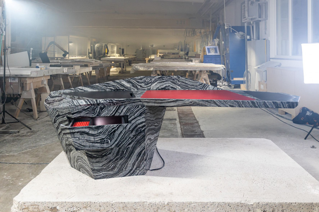 Podjetje Marmor Hotavlje je v sodelovanju z večkrat nagrajenim arhitektom in oblikovalcem Alexandrom Purcellom Rodriguesom izdelalo posebno mizo, ki ponazarja pomol iz naravne skale. (Foto: Marmor Hotavlje)