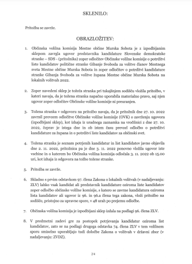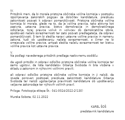 Gibanje svoboda sporno nastopa na lokalnih volitvah Murska Sobota ugovor SDS sodba občinske volilne komisije