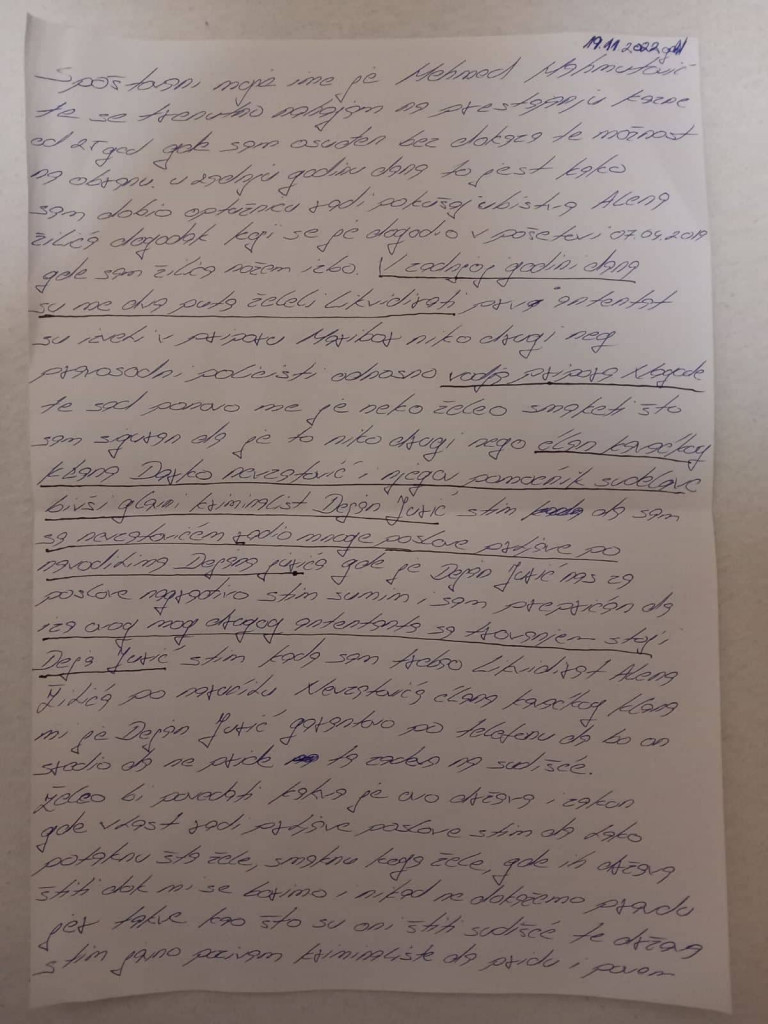 Sedaj pa je v naše uredništvo po skritih kanalih prišlo še pismo Mehmetovića iz dne 18. novembra 2022. V njem še enkrat razkrije celotno zgodbo in svoje poznavanje z Juričem in Nezvatovićem. Tako še enkrat razkrije svojo zgodbo sumov, da so ga hoteli zastrupiti v mariborskem priporu s pomočjo tam zaposlenih pravosodnih policistov. Že ob objavi našega članka pa so nekaj dni kasneje se odzvali v Upravi RS za izvrševanje kazenskih sankcij in zanikali navedbe Mehmetoviča.