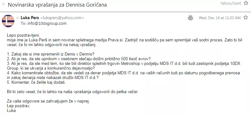 Po pričanju zastopnika oškodovane družbe na obravnavi na mariborskem sodišču dne 1.12.2022, se je namreč Dennis Goričan, po uspešno speljanem poslu prevzema spletnih trgovin, zaposlil pri oškodovani družbi kot direktor spletnih trgovin Metroshop.