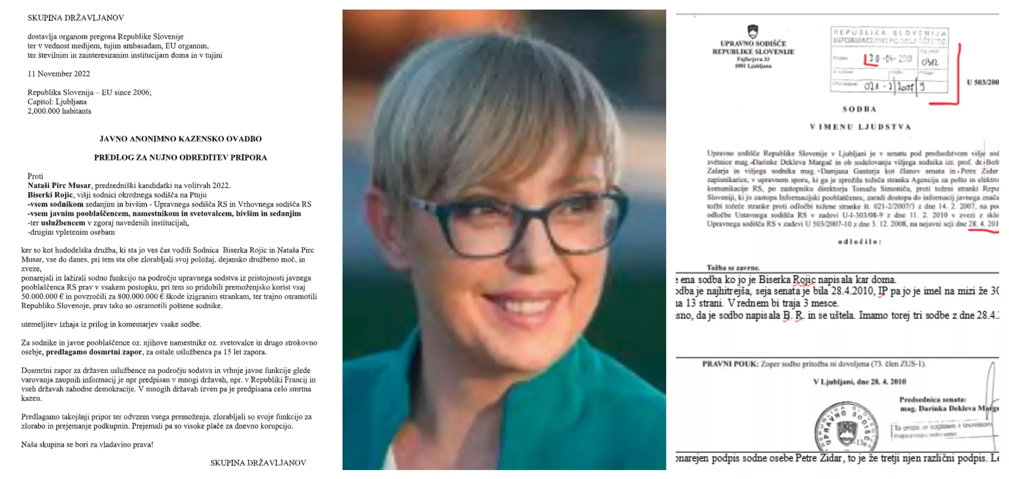 Skupina anonimnih državljanov je enajstega novembra 2022 vložila Javno anonimno kazensko ovadbo za nujno odreditev pripora za prihajajočo predsednico države Natašo Pirc Musar, ptujsko sodnico Biserko Rojic in še proti drugim višjim predstavnikom slovenskega sodstva. V ovadbi je bilo podanih petnajst domnevnih spornih sodb, ki so se vse končale v korist Urada informacijskega pooblaščenca. Urad informacijskega pooblaščenca v vseh primerih nastopa kot TOŽENA STRANKA. V njih so se znašli Telekom (2015 in 2017), SPL (2018, SPL je zastopala odvetniška družba Pirc Musar & partnerji), Ministrstvo za notranje zadeve (2019), Slovenska odškodninska družba (2010),občina Mengeš (2019), občina Žužemberk (2018), Elektroservisi (2010), Sodni svet (2017), Verbund (2019), Ministrstvo za izobraževanje, znanost in šport RS (2018), Kapitalska družba pokojninskega in invalidskega zavarovanje (2010), Agencijo za pošto in elektronske komunikacije RS (2010), Banka Slovenije (2015) in Univerzitetni klinični center Maribor (2022). V njih avtorji ovadbe očitajo, da je šlo do ponareditve podpisov uradnih oseb, vse to pa naj bi ves čas vedeli tako Nataša Pirc Musar kot Mojca Prelesnik. V našem mediju nismo strokovnjaki za preverjanje ponarejanje podpisov, zato nikogar tudi ne obtožujemo, da je to dejanje dejansko storil. Vendar se pojavlja predvsem drugo vprašanje. Zelo verjetno so hoteli avtorji ovadbe opozoriti na omenjene sodbe z namenom, da je lahko prišlo v postopkih do drugih hujših pravnih kršitev. Avtorji ovadbe pa še posebej izpostavljajo sodbe Kapitalske družbe pokojniskega in invalidskega zavarovanja, Agencije za pošto in elektronske komunikacije, ko je bila informacijska pooblaščenka Nataša Pirc Musar. Čudi jih, da so bile vse obravnavane 28.4.2010, urad informacijske pooblaščenke pod vodstvom Pirc Musar pa je sodbe prejel že med 30. aprilom in 12. majem 2010. Po mnenju avtorjev bi morali sodbe dobiti komaj za dva meseca kar je ustaljen postopek. "Sodnica Biserka Rojic in Nataša Pirc Musar, vse do danes, pri tem sta obe zlorabljali svoj položaj, dejansko družbeno moč, in zveze, ponarejali in lažirali sodno funkcijo na področju upravnega sodstva iz pristojnosti javnega pooblaščenca RS prav v vsakem postopku, pri tem so pridobili premoženjsko korist vsaj 50.000.000 € in povzročili za 800.000.000 € škode izigranim strankam, ter trajno osramotili Republiko Slovenoje, prav tako so osramotili poštene sodnike," zapišejo avtorje ovadbe. V primeru, da je bila ovadba dejansko vložena, upajmo le, da bodo organi pregona vzeli ovadbo zelo resno in se strokovno lotili postopkov. Glede na obtožbe pa tudi javno pozivamo vse ustrezno strokovne in kvalificirane pravne, ali po njihovem mnenju obtožbe na račun bodoče predsednice države Nataše Pirc Musar pijejo vodo ali ne.