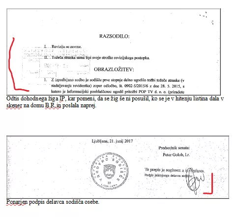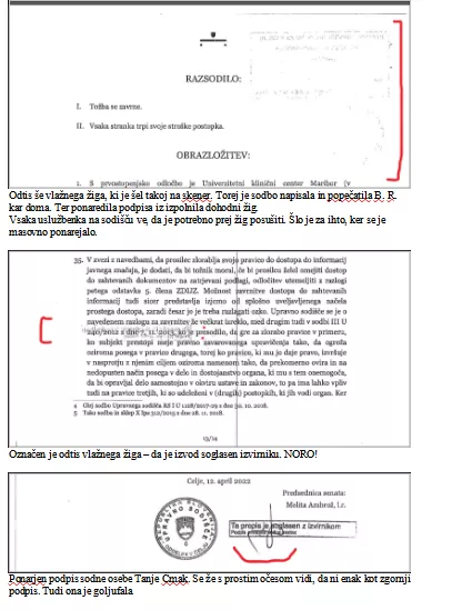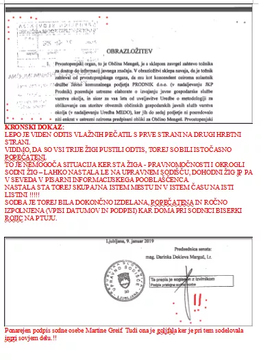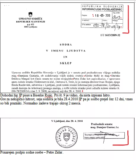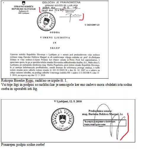 Poleg tega, da obtožujejo uradne osebe ponareditev podpisov se jim je zdelo zelo čudno, da so vse sodbe v Uradu informacijskega pooblaščenca dobili med 30. aprilom in 12. majem 2010. Sami trdijo, da bi za vsako sodbo moralo miniti vsaj dva meseca, ko senat sprejme odločitev. Zakaj se je tako mudilo in to še v tradicionalnem prazničnem času ne obstaja nobena razumna logična razlaga. Še enkrat, sami nikoga ne obtužujemo, da bi res prišlo do ponareditve podpisov in sodb.