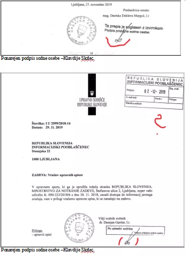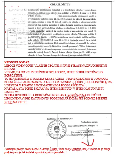 Skupina anonimnih državljanov je enajstega novembra 2022 vložila Javno anonimno kazensko ovadbo za nujno odreditev pripora za prihajajočo predsednico države Natašo Pirc Musar, ptujsko sodnico Biserko Rojic in še proti drugim višjim predstavnikom slovenskega sodstva. V ovadbi je bilo podanih petnajst domnevnih spornih sodb, ki so se vse končale v korist Urada informacijskega pooblaščenca. Urad informacijskega pooblaščenca v vseh primerih nastopa kot TOŽENA STRANKA. V njih so se znašli Telekom (2015 in 2017), SPL (2018, SPL je zastopala odvetniška družba Pirc Musar & partnerji), Ministrstvo za notranje zadeve (2019), Slovenska odškodninska družba (2010),občina Mengeš (2019), občina Žužemberk (2018), Elektroservisi (2010), Sodni svet (2017), Verbund (2019), Ministrstvo za izobraževanje, znanost in šport RS (2018), Kapitalska družba pokojninskega in invalidskega zavarovanje (2010), Agencijo za pošto in elektronske komunikacije RS (2010), Banka Slovenije (2015) in Univerzitetni klinični center Maribor (2022). V njih avtorji ovadbe očitajo, da je šlo do ponareditve podpisov uradnih oseb, vse to pa naj bi ves čas vedeli tako Nataša Pirc Musar kot Mojca Prelesnik. V našem mediju nismo strokovnjaki za preverjanje ponarejanje podpisov, zato nikogar tudi ne obtožujemo, da je to dejanje dejansko storil. Vendar se pojavlja predvsem drugo vprašanje. Zelo verjetno so hoteli avtorji ovadbe opozoriti na omenjene sodbe z namenom, da je lahko prišlo v postopkih do drugih hujših pravnih kršitev. Avtorji ovadbe pa še posebej izpostavljajo sodbe Kapitalske družbe pokojniskega in invalidskega zavarovanja, Agencije za pošto in elektronske komunikacije, ko je bila informacijska pooblaščenka Nataša Pirc Musar. Čudi jih, da so bile vse obravnavane 28.4.2010, urad informacijske pooblaščenke pod vodstvom Pirc Musar pa je sodbe prejel že med 30. aprilom in 12. majem 2010. Po mnenju avtorjev bi morali sodbe dobiti komaj za dva meseca kar je ustaljen postopek. "Sodnica Biserka Rojic in Nataša Pirc Musar, vse do danes, pri tem sta obe zlorabljali svoj položaj, dejansko družbeno moč, in zveze, ponarejali in lažirali sodno funkcijo na področju upravnega sodstva iz pristojnosti javnega pooblaščenca RS prav v vsakem postopku, pri tem so pridobili premoženjsko korist vsaj 50.000.000 € in povzročili za 800.000.000 € škode izigranim strankam, ter trajno osramotili Republiko Slovenoje, prav tako so osramotili poštene sodnike," zapišejo avtorje ovadbe. V primeru, da je bila ovadba dejansko vložena, upajmo le, da bodo organi pregona vzeli ovadbo zelo resno in se strokovno lotili postopkov. Glede na obtožbe pa tudi javno pozivamo vse ustrezno strokovne in kvalificirane pravne, ali po njihovem mnenju obtožbe na račun bodoče predsednice države Nataše Pirc Musar pijejo vodo ali ne.