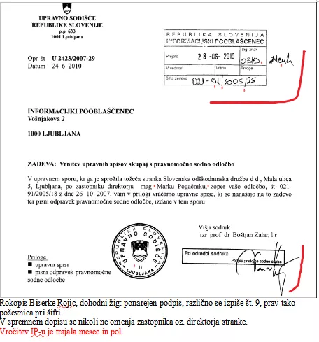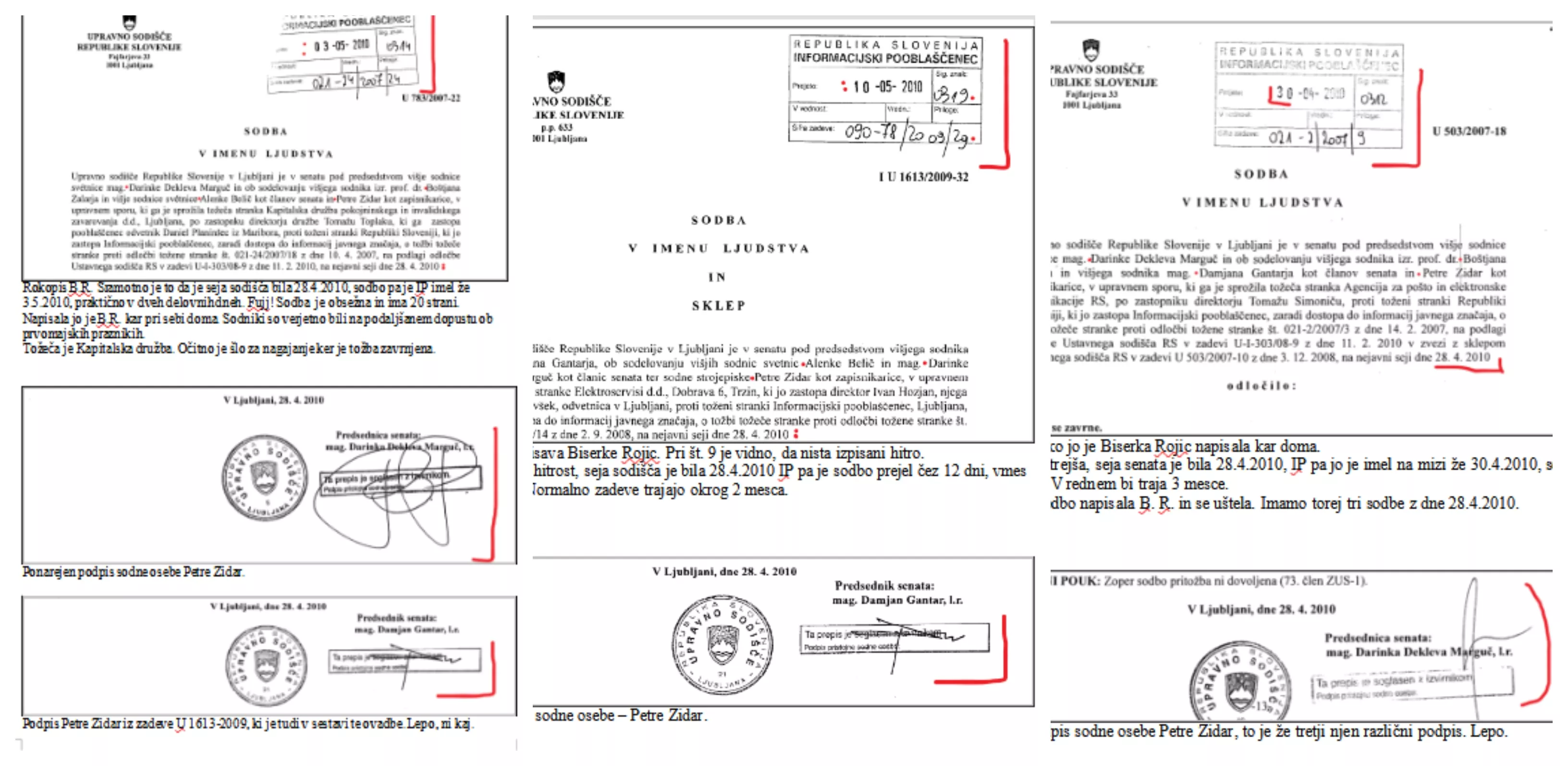 V svojih prilogah pa posebej izpostavljajo primere iz leta 2010, ko je Urad informacijskega pooblaščenca vodila Nataša Pirc Musar. Izpostavijo tri sodbe ( Kapitalska družba pokojninskega in invalidskega zavarovanja, Agencija za pošto in elektronsko komunikacije, Elektroservisi). Predvsem se jim zdi čudno, da je sodni senat o vseh treh primerih odločal 28.4.2010.