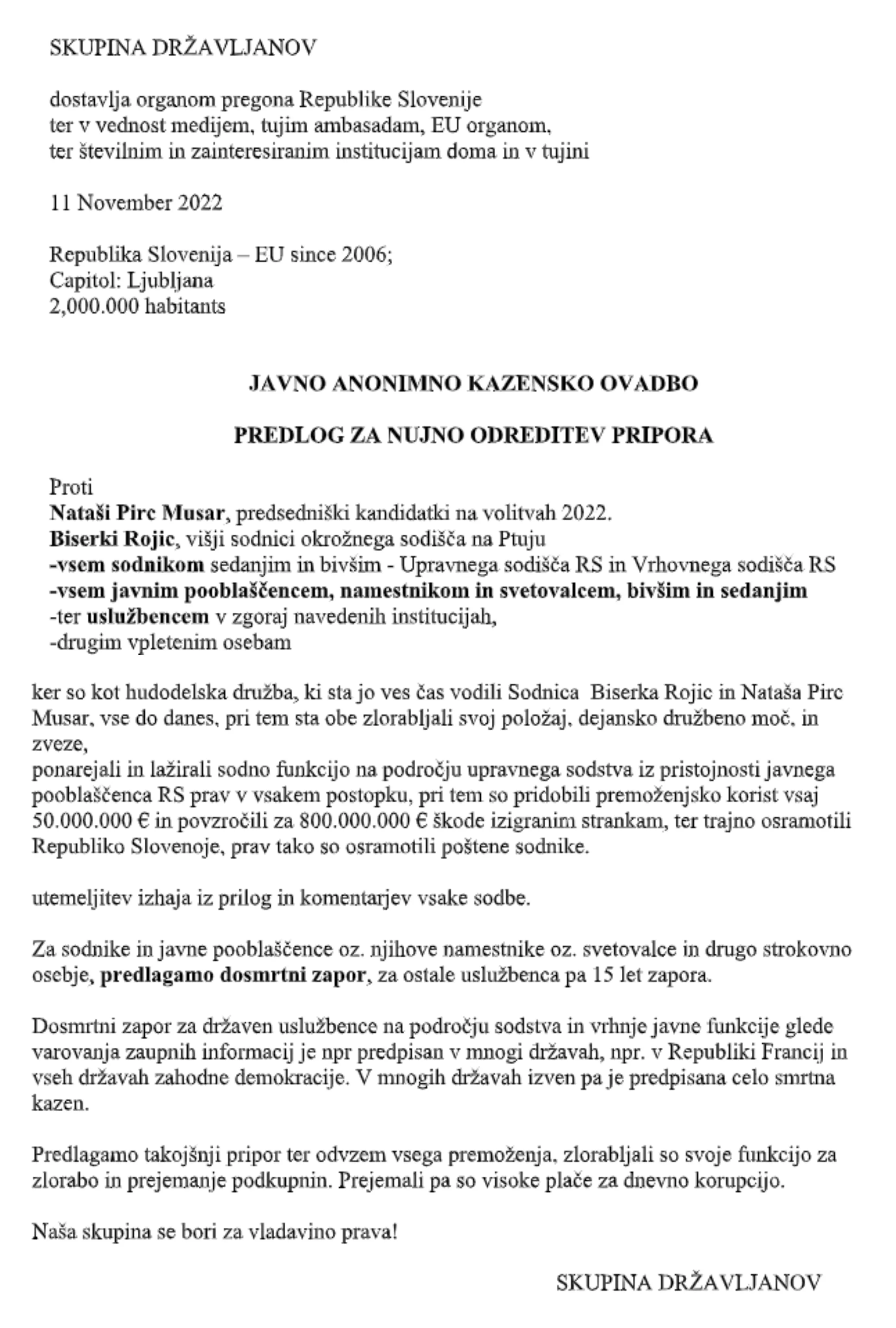 Tako je dvomljiva skupina slovenskih državljanov dne 11. novembra 2022 podala Javno anonimno kazensko ovadbo za nujno odreditev pripora. Dvomljivi in zaskrbljeni slovenski državljani so nujno odreditev pripora zahtevali za Natašo Pirc Musar, višjo ptujsko okrožno sodnico Biserko Rojic, proti vsem bivšim in sedanjim sodnikom na Upravnem sodišču Republike Slovenije in Vrhovnega sodišča, vsem javnim pooblaščencem, bivšim in sedanjim namestnikov in svetovalcev, uslužbencem v zgoraj navedenih institucijah ter drugim vpletenim osebam.