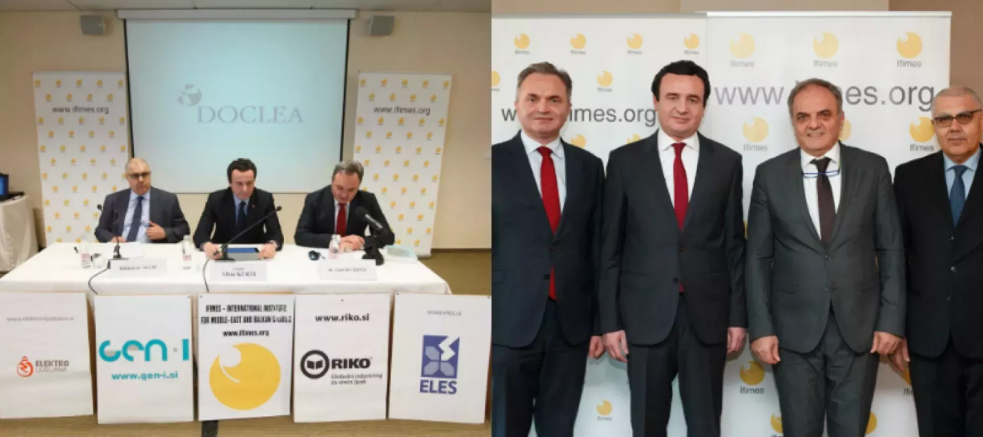 Na levi strani dogodek IFIMES-a v letu 2016. Od leve proti desni Bakhtyar Aljaf , Albin Kurti in Zijad Bećirović. Na desni strani fotografija IFIMES-a iz leta 2018. Iz leve proti desni Zijad Bećirović, Albin Kurti, Martin Berishaj in Bakhtyar Aljaf. (Foto: Posnetek zaslona-IFIMES, Facebook, Nova24tv)