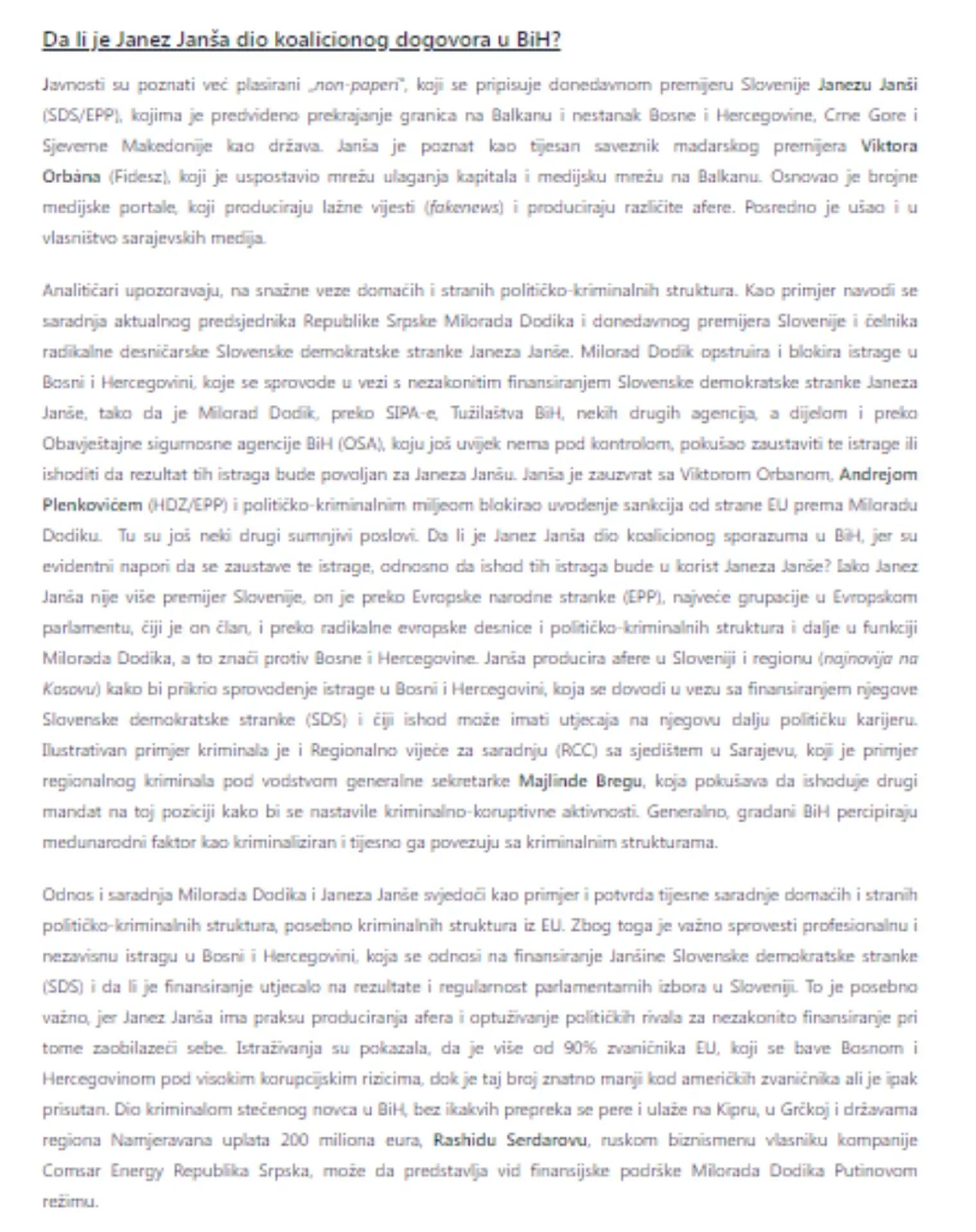 Vendar so jih slike tako sprovocirale, da je IFIMES takoj objavil analizo o domnevno sumljivem bosanskem financiranju Janševe SDS. Oziroma so morali v svojo analizo nekam vtakniti Janšo. Če ni Janše, ni zgodbe!!! Po drugi strani pa v istem besedilu dobesedno jočejo, zakaj ni uspel preboj v parlament enemu najbogatejših in razvpitih bogatašev v BiH Fahrudinu Radončiću, rojenemu v okolici črnogorskega kraja Berane.