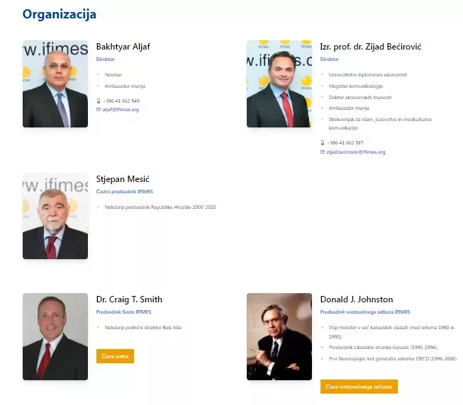 IFIMES-ova dolgoletna direktorja sta že dlje časa v Sloveniji živeči iraški Kurd Bakhtyar Aljaf, ter dolgoletni novinar in v slovenski javnosti zelo poznan izr. prof. dr. Zijad Bećirović. Med njimi pa ne manjka eminentnih političnih imen. Med drugim, nekdanji hrvaški predsednik in odličen prijatelj Boža Dimnika Stipe Mesić v inštitutu zaseda mesto častnega predsednika. Zanimiva pa so tudi druga imena.