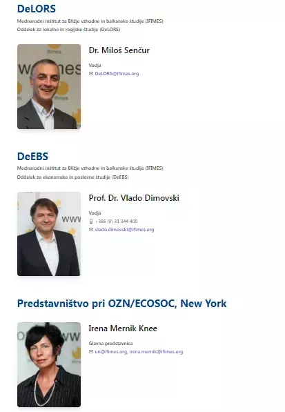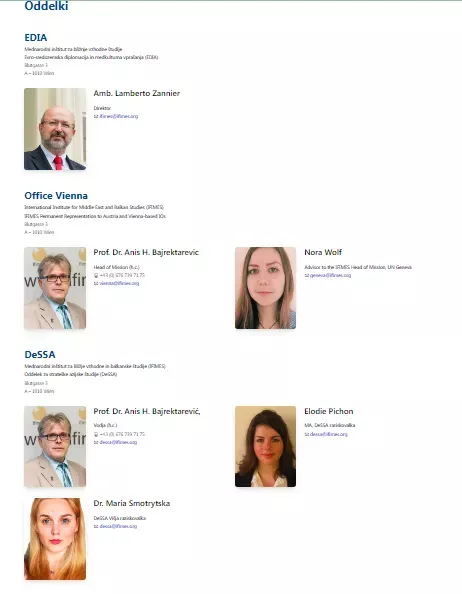 V rubriki Oddelki pa lahko opazite, da imajo na Dunaju vzpostavljen Evro-sredozemska diplomacija in medkulturna vprašanja ( EDIA). Kot direktor se predstavlja italijanski diplomat ter nekdanji višji uslužbenec organizacije OSCE Amb. Lamberto Zannier. Vodja predstavništva na Dunaju je prof. Dr. Anis H. Bajrektarevic in Nora Wolf, svetovalka v švicarski stavbi Združenih narodov. Bajrektarjevič pa na Dunaju vodi še oddelek za strateške azijske študije. Njegovi sodelavki sta Elodie Pichon in Dr. Maria Smotrytska. Oddelek za lokalne in regijske študije (DeLORS) vodi nekdanji član Golobivečeve stranke Zares dr. Milan Šenčur. Oddelek za ekonomske in poslovne študije (DeEBS) predstavlja nekdanji vidni član Socialnih demokratov Vlado Dimovski. Predstavništvo pri OZN/ECOSOC v imenu IFIMES-a predstavlja Irena Mernik Knee, svetovalka nekdanjega predsednika države Danila Türka, ko je opravljal službo v Združenih narodih.