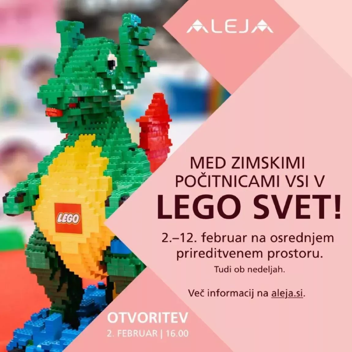 Med zimskimi počitnicami so v našem najboljšem novem nakupovalnem središču ALEJA za otroke pripravili številne zanimive dejavnosti. Na osrednjem prireditvenem prostoru je odprta prav posebna LEGO igralnica. V njej se lahko otroci brezplačno igrajo in ustvarjajo z LEGO kockami do neskončnosti vsak dan od 10. do 20. ure, ob nedeljah od 11. do 18. ure. Igralnica bo odprta vse do nedelje, 12. februarja. Otroci se lahko v njej zabavajo tudi na Prešernov dan, v sredo, 8. februarja.