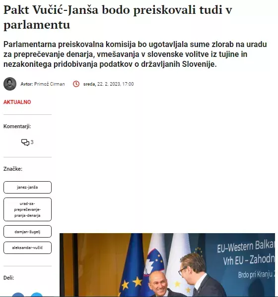 Spletni medij Necenzurirano je objavil novico z naslovom Pakt Vučić-Janša bodo preiskovali tudi v parlamentu . V njem so zapisali, da bo parlamentarna preiskovalna komisija ugotavljala sume zlorab na uradu za preprečevanje denarja, vmešavanja v slovenske volitve iz tujine in nezakonitega pridobivanja podatkov o državljanih Slovenije. Zakaj se v resnici sploh gre?