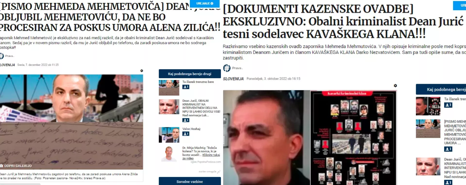 V lanskem letu smo objavili dva članka z naslovom [DOKUMENTI KAZENSKE OVADBE] EKSKLUZIVNO: Obalni kriminalist Dean Jurić tesni sodelavec KAVAŠKEGA KLANA!!! (3.2.2022) in [PISMO MEHMEDA MEHMETOVIČA] DEAN JURIČ OBLJUBIL MEHMETOVIĆU, DA NE BO PROCESIRAN ZA POSKUS UMORA ALENA ZILIĆA!! (7.12.2022) problematizirali sodelovanje med članom slovenske celice Kavaškega klana Darko Nezvatovićem in obalnim kriminalistom, nekdanjim vodjem SK PU Koper Deanom Juričem. Iz slovenske policije pa so nam pred kratkim sporočili, da je Jurič sedaj zaposlen na NPU UKP GPU. Na podlagi predstavljenih kazenskih ovadb in pisem je zapornik Mehmed Mahmetovića obtožil večkrat Nezvatovića, da je ves čas deloval pod direktnimi ukazi Juriča. V obeh člankih so bile napisane hude obtožbe s strani Mahmetovića, da sta prav Nezvatović in Jurič mu naročila, da naj ubije enega izmed zapornikov v enem izmed slovenskih priporih. Jurič pa je Mahmutoviću še obljubljal, da za poskus umora sploh ne bo procesiran. V obeh člankih se je tudi razkrilo, da je Nezvatović skupaj s svojimi člani ustahoval obalne dilerje ter za Juriča kradel drogo in denar. Mahmutović je tudi zatrdil, da je Jurič odgovoren za krajo del zaplenjne 400 kilogramov pošiljke kokaina. Nezvatović pa je tudi po naročilu Juriča enemu "ciganu" na Obali odrezal prst. Vse to je razkril Mehmed Mahmutović v podanih kazenskih prijavah na policijo, NPU in slovensko tožilstvo.