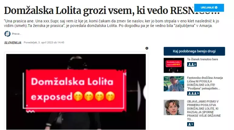 Dne tretjega aprila 2023 smo objavili članek z naslovom Domžalska Lolita grozi vsem, ki vedo RESNICO!!!. V našem uvodu smo zapisali sledeče: