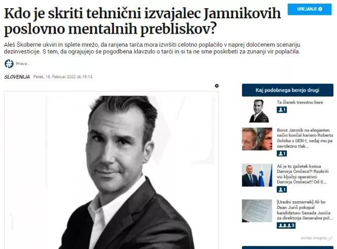 Še enkrat se je izkazalo, da osrednji mediji z velikim strahom objavijo kdaj pa kdaj kakšno kritično novičko o bančnem vajencu Jamniku. Spomnite se samo afere pred slabimi dvajsetimi leti, ko je hotel svojo priljubljenost na političnem parketu preveriti nekdanji guverner BS France Arhar. A je hitro ugotovil, da se naj raje ukvarja z bančništvom kot politiko. Takrat so mu osrednji slovenski mediji očitali, da je imel kot predsednik Zavarovalnice Vzajemne mesečno plačo v višini sedanjih treh tisoč evrov. Ta isti osrednji mediji pa so slabih dvajset let kasneje obrnili ploščo in si niso upali problematizirati sporne visoke plače aktualnega bančnega vajenca z SID banke. Ob isti uredniški politiki! Dolgoletni državni uradnik, sedaj bančni vajenec Jamnik se je še enkrat izkazal s svojimi bonbončki. Zelo sumimo, da je še okrepil sodelovanje z akterji poslovnega kroga fantka kardinala Franceta Rodeta. Drugače ne moremo razlagati, zakaj bi član krščanske stranke Nove Slovenije Branko Tomažič kot predsednik NS SID banke pristal na ŠKANDALOZNO VISOKO PLAČO ZA BANČNEGA VAJENCA!!!