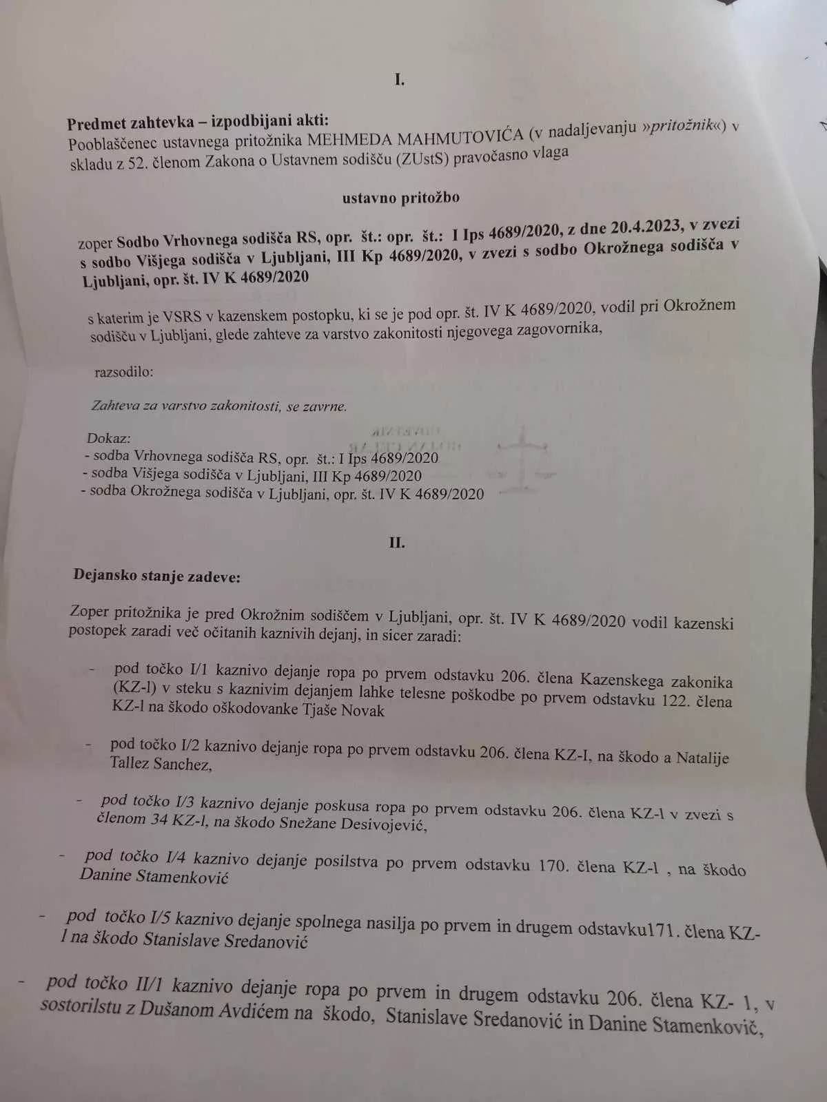 "Takšen dokaz je zagotovo relevanten, z njim bi se dokazovalo, da je pri dejanju sodelovala tretja oseba in ne obdolženec, kar je absolutno pravno relevantno dejstvo. Pravica do obrambe je bila tako kršena ne zgolj iz razloga, kar so bili zavrnjeni "praktično vsi" dokazni predlogi obrambe, temveč tudi predlogi, za katere je žena prvi pogled jasno da so lahko pomembni in da bi seveda lahko vodili k drugačni odločitvi sodišča," je zapisano v ustavni pritožbi Mehmeda Mahmutovića. Le ta je bil v preteklosti obsojen na 25 letno zaporno kazen zaradi posilstva in ropov petih ljubljanskih prostitutk. Vendar nam huda zaporna kazen po našem lastnem branju besedila ustavne pritožbe močno smrdi. Spoštovani bralci in ustrezno kvalificirani pravni strokovnjaki, na koncu teksta si lahko preberete celotno besedilo ustavne pritožbe. Vendar mi zelo sumimo, da je Mahmutovič tako visoko zaporno kazen prejel, ker v preteklosti ni molčal. Tako je sam razkril, da je v letu 2018 sodeloval skupaj z osrednjo priča tožilstva v procesu Kavaški klan Darko Nevzatovićem. Le ta je po mnenju Mahmutovića deloval po navodilih sedaj že upokojenega obalnega kriminalista Deana Juriča. Kot smo sami izvedeli, sta se Nevzatović in Jurič srečala enkrat v poletnih mesecih pred piransko garažno hišo v letu 2018. Naši viri zatrjujejo, da se je to zgodilo meseca avgusta. Isto je Mahmutovič javno razkril, da je bil Nevzatović vpleten v zaseg 400 kilogramov kokaina v Luki Koper v letu 2021. Mahmutović je še kako pomemben v zgodbi Kavaškega klana. Obramba ves čas trdi tezo, da je bil osrednja priča tožilstva Darko Nevzatović že pred 23.5.2020 sodelavec policije in je sodeloval s strukturami obalne kriminalistične klike. Zakaj ga obramba ne pokliče za pričo? Z največjim veseljem bo Mehmed Mahmutović na sodišču govoril svoje izkušnje o Nevzatoviću in Juriču.