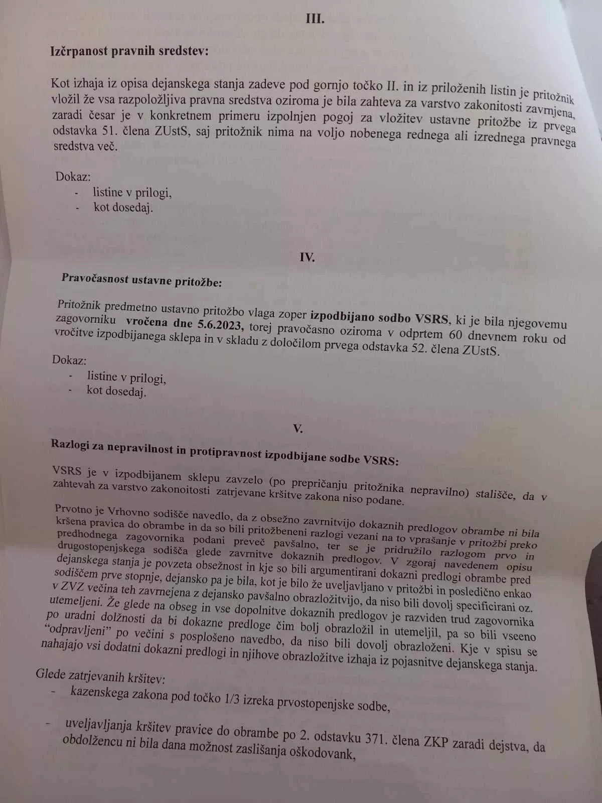 "Ustavnemu sodišču RS mora pritožnik izpostaviti, da iz odločbe Ustavnega sodišča RS Up 13/94 z dne 8.6.1995 izhaja, da glede na načelo proste dokazne presoje sodišče v kazenskem postopku samo odloča o tem, katere dokaze bo izvedlo in kako bo presojalo njihovo verodostojnost. Pri tem pa mora po instrukcijski maksimi skrbeti, da se zadeva vsestransko razčisti, da se dožene resnica, sme pa odvrnit tisto, kar bi zavlačevalo postopek ne da bi koristilo razjasnitvi stvari. Vendar pa prizadevanje sodišča za izvedbo postopka brez nepotrebnega zavlačevanja, ne pomeni nespoštovanje obdolženčevih ustavnih pravic. Glede na določbo 1. odst. 15. člena Ustave RS so namreč sodišča dolžna ustavne določbe o človekovih pravicah in svoboščinH uporabljati neposredno. Ena od pravic, ki jih obdolžencu zagotavlja ustava, je tudi pravica do zagotovitve izvajanja dokazov v njegovo korist (tretja alineja 29. člena). Sodišče je dolžno ugoditi dokaznim predlogom obdolženca, ki naj bi po njegovih sklepčnih navedbah potrdili oziroma zanikali obstoj pravno relevantnih dejstev, to je dejstev, na katerih temlji neposredna uporaba materialnega in procesnega kazenskega prava v določeni zadevi. V kolikot obdolženec torej izkaže relevantnost dokaznega predloga, mora sodišče izvesti dokaz, ki bi se lahko izkazal v njegovo korist ne glede na načelo proste presoje dokazov. Kot že navedeno je obramba obdolženca podala na več mestih sorazmerno obsežne in po oceni pritožnika tudi obrazložene dokazne predloge, ki so bili praktično skoraj vsi zavrnjeni. Tudi če bi pritožnik v pritožbi, kot je to navedlo Višje sodišče preveč presplošno argumentiral dokazni predlog o zaslišanju kriminalista o tem, kako in kakšen način je bila odvzeta biološka sled s kljuke pri kaznivem dejanju pod točko I/2 in glede dokaznega predloga, o statusu številke 070 316 689, pri k.d. pod točko II/1. Gre za telefonsko številko iz katere naj bi storilec oz. storilca klicala oškodovanko, ta telefonska številka pa ni pripadala obdolžencu, na podlagi česar je seveda možno sklepati da je bil storilec neka tretja oseba. Še posebej brez trdnih dokazov (jasna prepoznava itd.), da naj bi dejanje storil prav obdolženi, bi se lahko s tem dokaznim predlogom ugotovilo, kdo je uporabljal telefon v času dejanja in je toječ očitno tudi pravi storilec. "