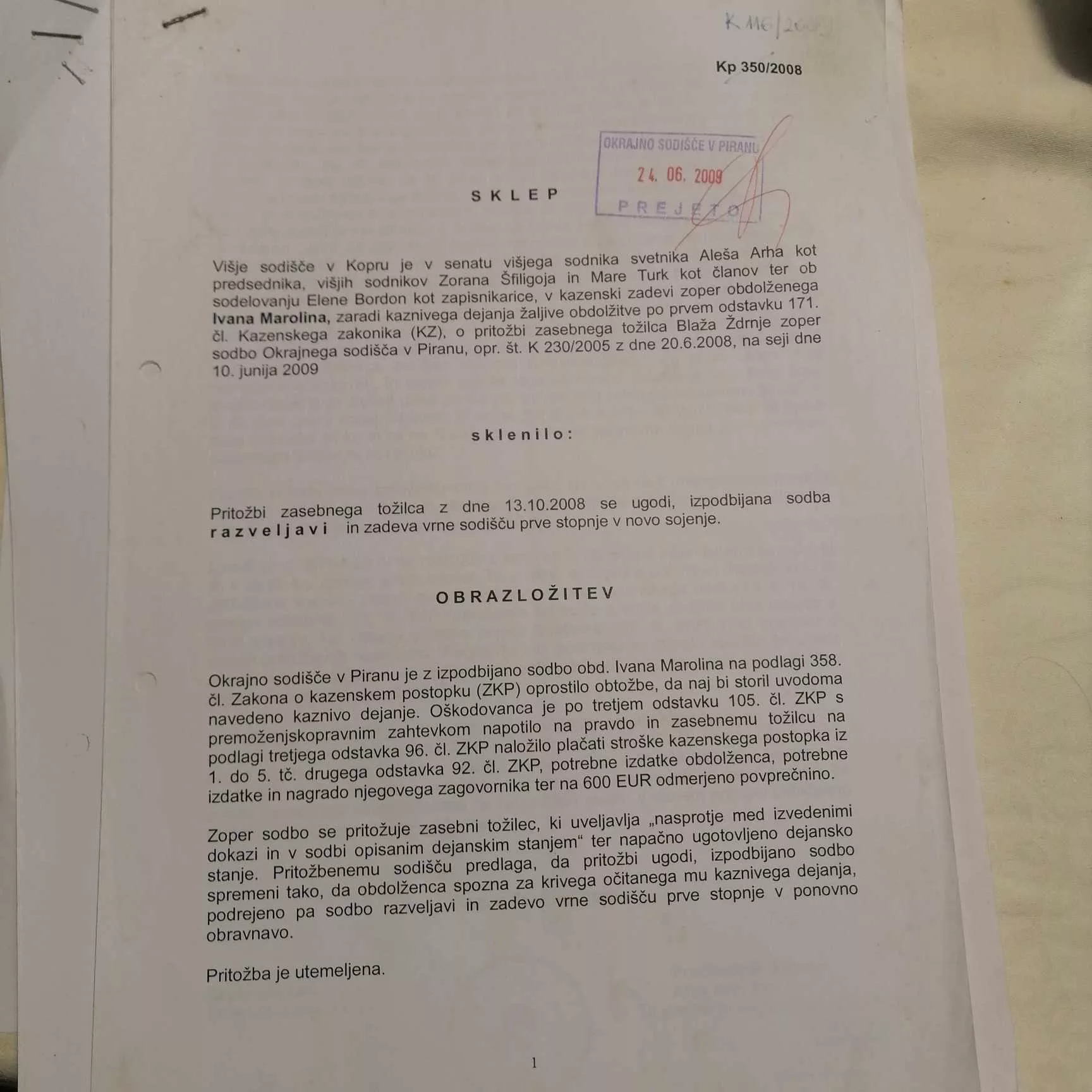 Sedmega marca 2008 je bila prva obravnava v omenjeni zadevi. Na tej obravnavi Marolin ni priznal krivde in se je izrekel za nedolžnega. Žvrdnja je predlagal, da se kot priče zaslišijo policiste PP Piran in Mileno Tigeltijo.