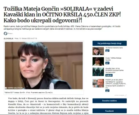 Tudi mi smo v preteklosti že omenjali Matejo Gončin. Trinajstega oktobra 2023 smo objavili članek z naslovom Tožilka Mateja Gončin »SOLIRALA« v zadevi Kavaški klan in OČITNO KRŠILA 450.ČLEN ZKP! Kako bodo ukrepali odgovorni?!. V njem smo problematizirali dejstvo, da Mateja Gončin z obiskom pri "skesancu" Alenu Bajcu kršila 450. člen Zakona o kazenskem postopku. Da je kršila 450. člen ZKP si nismo MI IZMISLILI!, ampak je to povedal predsednik senata v zadevi Kavaški Klan Tomaž Bromše. Specializirano državno tožilstvo je tudi nam poslalo zahtevek za popravko članka, a smo ga zavrnili. Smo pa bili toliko fair play in sem ga objavil na mojem X profilu.