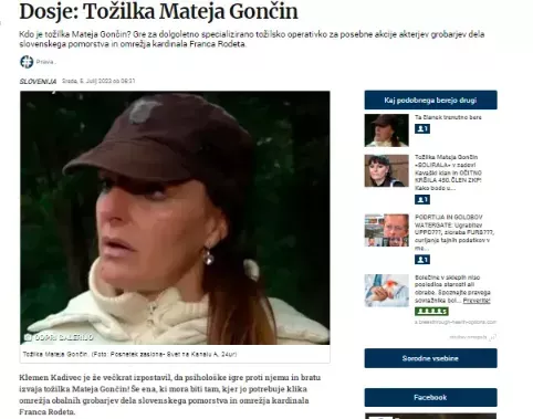 Veliko bolj kritično pa smo tožilko Matejo Gončin predstavili v članku z naslovom Dosje: Tožilka Mateja Gončin objavljenega dne 5. julija 2023. Med drugim smo zapisali, da gre za ključno operativko za posebne akcije akterjev grobarjev dela slovenskega pomorstva in omrežja tožilke Blanke Žgajner.