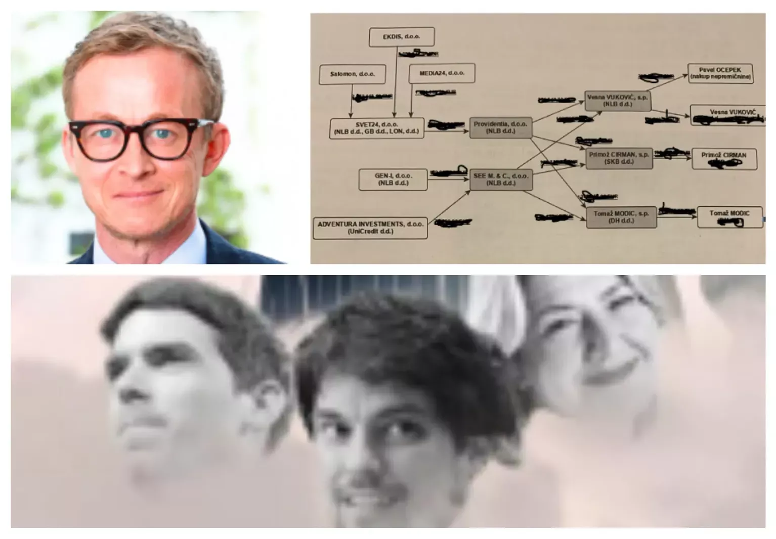 Trenutni predsednik državne SID banke Borut Jamnik, shema potovanja denarja za nekdanjo novinarsko trojko Tomaž Modic, Primož Cirman in Vesne Vukovič. (Foto: Posnetek zaslona- SID banka, Prava.si in fotomontaža Nova24tv)