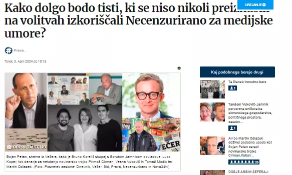 V našem mediju se tokrat malo za hec posvečamo nekdanji dolgoletni novinarski trojki Vesni Vukovič, Primožu Cirmanu in Tomažu Modicu. Svojo skupno pot so pričeli na Dnevniku, kasneje pa nadaljevali na državnem spletnem mediju Siol ter kasneje v mediju Necenzurirano. Zdaj pa je lastnik medija Necenzurirano družba Media Partner Agencija v lasti družbe Svet24. Lastnica družbe Svet24 pa je Alenka Nardini, nekdanja žena Martina Odlazka. Vendar se na predstavljeni shemi ene izmed uradnih slovenskih institucij vidi, da so tudi podjetja v lasti Martina Odlazka z milijoni evrov financirale delovanje družbe Svet24.