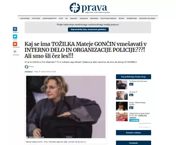 Verjetno smo EDINI MEDIJ V DRŽAVI!!!, ki ni nasedel na zgodbo, ki jo prodaja preko svojega odvetnika Davida Sluge tožilka SDT Mateja Gončin o svojem varovanju. Spoštovani slovenski državljani, kaj se ima ena tožilka z odvetnikom vmešavati v interno delo samostojne policijske enote kot je Center za varovanje in zaščito. Samo zaradi tega, ker je nek njen varnostnik dobil slabšo delovno oceno vodstva CVZ! Pa naj se pritoži na ustrezen organ in je zadeva rešena!