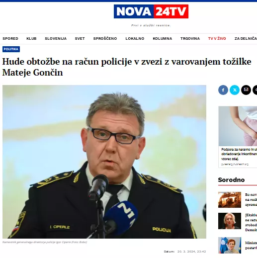 Ob koncu preteklega leta je v slovenski javnosti dokončno postala ena osrednjih medijskih političnih tem varovanje tožilke Specializiranega državnega tožilstva Mateje Gončin. Trikrat ugibajte, kateri medij je o tej aferi v naši državi prvi poročal? Glej ga zlomka, za družino osrednjih slovenskih medijev in tranzicijske levice "večno problematična" Nova24tv dne 20. marca 2024 s člankom Hude obtožbe na račun policije v zvezi z varovanjem tožilke Mateje Gončin. Pa tudi naš pa še nekaj drugih medijev imajo za "problematične."