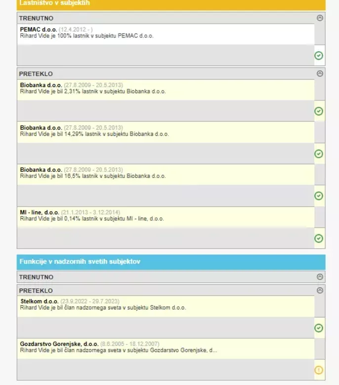 Tukaj si lahko ogledate, v katerih podjetjih v preteklosti je bil delni lastnik Rihard Vide. V letu 2022-2023 pa je bil tudi član nadzornega sveta Stelkom. (Foto: Posnetek zaslona-E-bonitete)