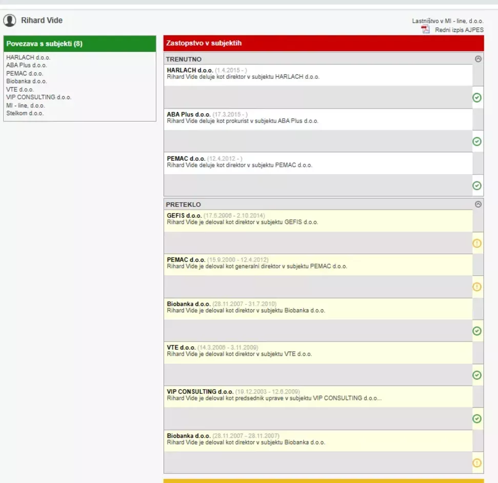 Podjetja, v katerih je Rihard Vide opravljal vlogo direktorja družbe. (Foto: Posnetek zaslona-E-bonitete)