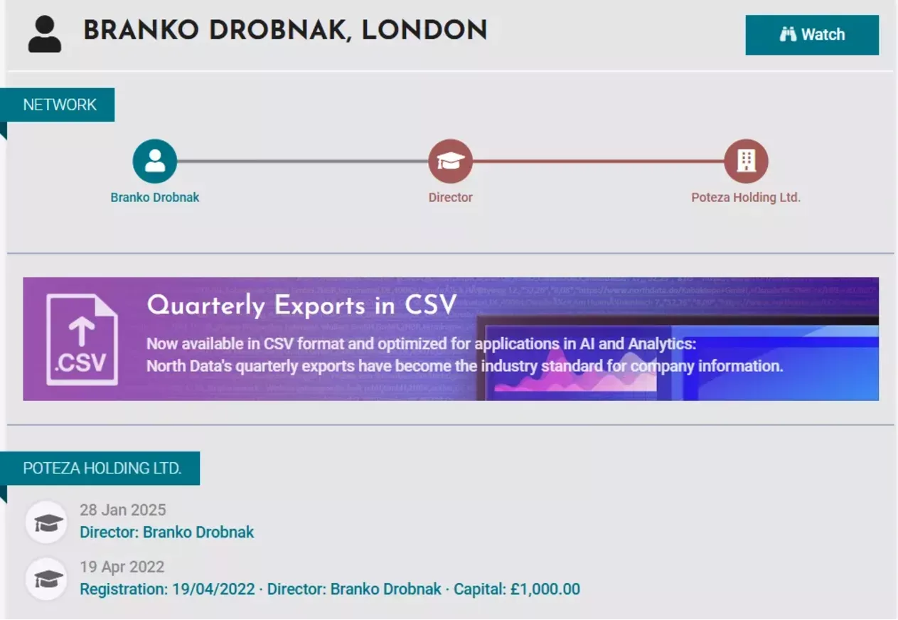 Vendar sodeč po podatkih spletne strani Northdata je Drobnak v Londonu leta 2022 ustanovil ponovno podjetje z imenom Poteza s sedežem v Londonu. Dremljeva je bila dolgoletna sodelavka Drobnjaka in zdaj predsednica združenja Poslovni angeli Slovenije.
