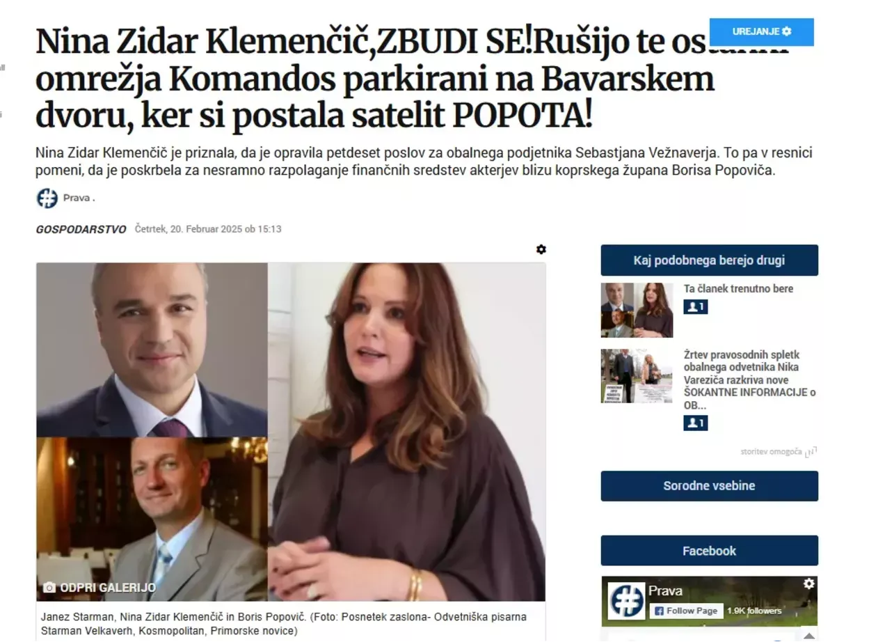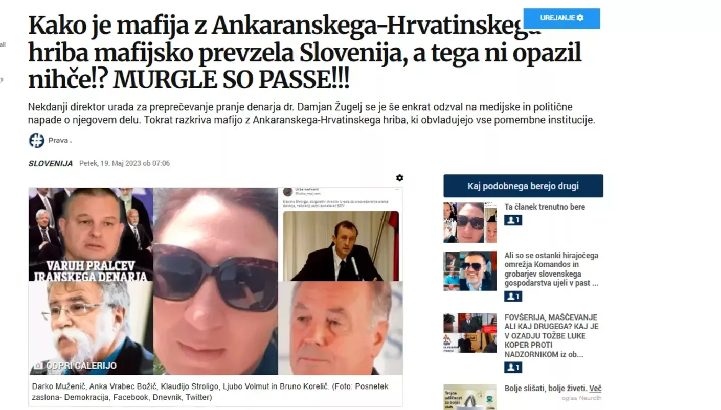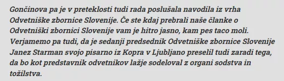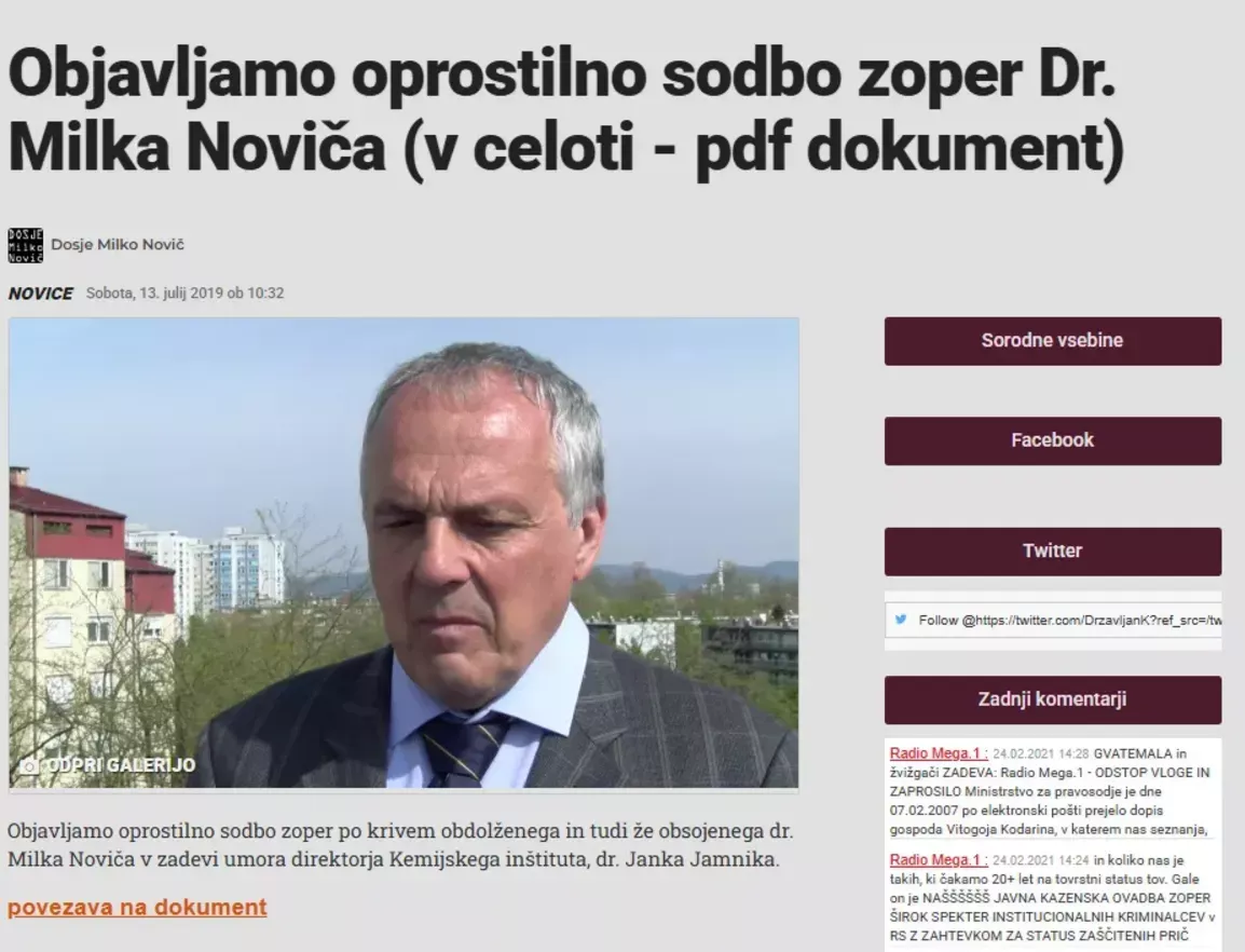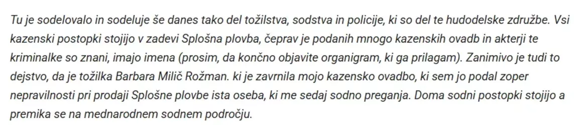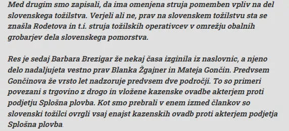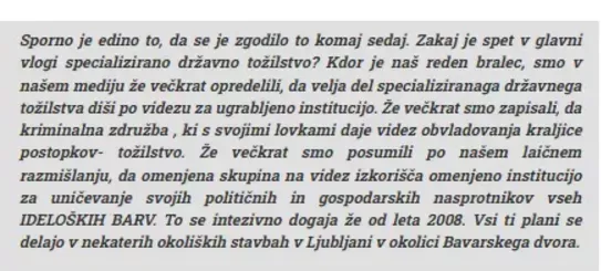 »Gre za veliko netransparentno skupino s številnimi akterji – kot nekakšno razvejano 'multinacionalno' združbo. Način delovanja je že znan: od zunanje režije, skrbno načrtovane montaže, izkrivljanja in manipulacije, do končne medijske likvidacije – vse z namenom doseči cilje ozke kriminalne skupine, ki je davno ugrabila ključne državne institucije. Gre za šolski primer t. i. 'state capture' – ugrabitve države.«