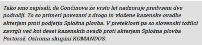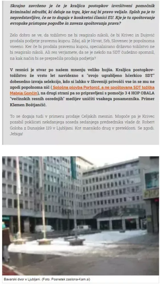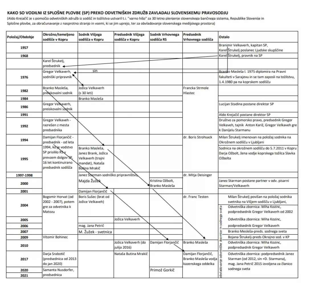 Težava je še toliko večja, ker je kriminalna združba, sestavljena iz odvetniške pisarne z Obale in v Ljubljani, s sedežem na Bavarskem dvoru ter podprta s kadri iz poslovnega miljeja Splošne plovbe Portorož (neformalna skupina KOMANDOS), z ideologijo postkomunističnih metod starih, odpadnih vojaških struktur, ugrabila del sodstva (Vrhovno sodišče RS) in del kraljice postopkov (Specializirano državno tožilstvo).
