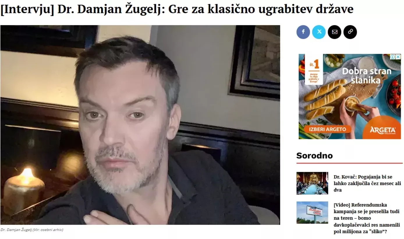 »Ta ugrabitev se ni začela z ostanki nekdanjega režima, ki so se bali, da bodo v normalni evropski demokraciji izgubili vpliv. Sledila je desetletja dolga infiltracija, po kateri je ena sama skupina prevzela vse vzvode oblasti. Danes v Sloveniji ni več medsebojnega nadzora med institucijami. En del sodstva, tožilstva in policije je ugrabljeno. Vse poteka po enaki shemi: postopkovni teror, dolgotrajni procesi, uničenje osebnega in poslovnega življenja – in vedno isti akterji v ozadju, brez vsakršne politične barve.«