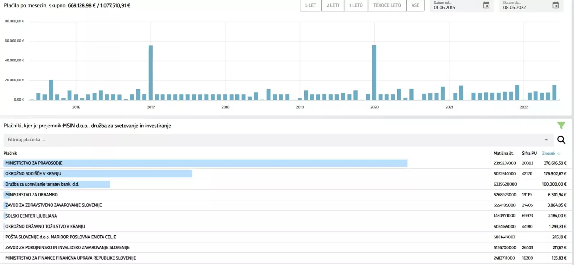 Po podatkih informacijskega sistema ERAR, ki ga upravlja Komisija za preprečevanje korupcije in omogoča javni vpogled v porabo državnega denarja, so se prihodki družbe MSIN iz državnega proračuna skoraj podvojili po začetku mandata aktualne vlade. V obdobju od leta 2016 do sredine 2022 je MSIN prejel 669.128,98 evra, medtem ko je v zadnjih treh letih pod Golobovo vlado ta znesek zrasel na 1.077.510,91 evra.