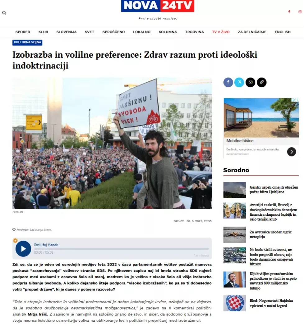 Zdaj je več kot očitno znano, zakaj se je zgodila cenzura zadnje Tarče. Kljub temu da sta hoteli direktorica Televizije Slovenije Ksenija Horvat in Polona Fijavž s pomočjo izjav Društva novinarjev Slovenije, predstavnika Glasa ljudstva Jaše Jenulla in nekaterih osrednjih medijev zgodbo spreobrniti v popolnoma drugo smer – da je oddaja Tarča postala neprofesionalna in da ni vredna javnega servisa.Foto: Posnetek zaslona- N1 SlovenijaRes je, oddaja Tarča je verjetno že leto dni pod vodstvom depolitizirane elite tarča kritik. V času desnih vlad pomeni kritika Tarče konec neodvisnega novinarstva in rušenje »fašizma«, v času levih vlad pa pomeni kritika Tarče, da je uredništvo neodgovorno, Erika neprofesionalna in da so oddaje katastrofalne.Foto: Posnetek zaslona- Info360Ampak ekipa Tarče od svoje prve oddaje počne isto. Verjetno bodo to počeli tudi v prihodnje. Zato je prav, da imamo slovenski državljani vsaj tedensko možnost spremljati 70- minut raziskovalnega novinarstva na RTV Slovenija.Zelo verjetno je bil ključen razlog odpovedi Tarče zgodba o dopustovanju Roberta Goloba in njegove sedanje žene Tine Gaber Golob na hrvaškem Ugljanu leta 2025. Ekskluzivne informacije sta razkrila novinarja Zanima.me Mirko Mayer in Peter Merše v epizodah Tedenskega in Special safarija, Mayer pa je to zapisal še v članku z naslovom Razkrita »zlata kletka« Roberta Goloba: s Tino Gaber ga gostijo na Ugljanu, živi pri njih v Trnovem. Kdo nadzira njegovo intimo in državne milijone?.Foto: Posnetek zaslona-Zanima.meZgodba je dobesedno šokantna. Mogoče odgovarja še na eno misteriozno vprašanje – kdo v resnici plačuje eno najdražjih najemnin v Sloveniji in ali je to lahko povezano s sklenjenimi posli v hčerinskih družbah Slovenskih železnic.Že v preteklosti se je poročalo, da bi glede na podatke morala zakonca Golob–Gaber plačevati 4.500 evrov mesečne najemnine. Kljub temu da vsaj po javno dostopnih podatkih zakonca Gaber mesečno ne zaslužita več kot 5 tisoč evrov neto, se postavlja vprašanje, na kak način se najemnina plačuje.V tem stanovanjskem kompleksu v Trnovem živita zakonca Golob Gaber. Ali res plačujeta najemnino v višini 4500 evrov ali pa imata popust, ker se poznata osebno z lastnikom Darko Perkom? (Foto: Posnetek zaslona-X)Že lani so Slovenske novice in tudi Tarča poročale, da je stanovanje v Trnovem last podjetja Eltim podjetnika Darka Perka, tudi člana SDS in osebnega prijatelja Janše. Osrednji mediji pa so ga leta 2023 predstavljali kot enega izmed pobudnikov vaških straž na območju Ivančne Gorice. Mayer pa ga označuje za podjetnika, ki odlično sodeluje tako z levo kot z desno usmerjenimi ljudmi. Po dobrem letu dni bi bil lahko misterij skrivnostnega plačevanja najemnine razrešen. Vsaj po poročanju Zanima.me je zgodba zelo verjetno potekala takole: Tina Gaber Golob je v preteklosti delala tudi v eni izmed hčerinskih družb Slovenskih železnic, kjer je bil zaposlen tudi Miha Piškur, znan po svojem podjetju DC Limited, ki je bilo večkrat razkrito v zadnjih Tarčah. Prav Piškur naj bi Gabrovi omenil stanovanje v Trnovem v lasti Perka.Že večkrat so se pojavljala vprašanja, na kak način zakonca Golob–Gaber plačujeta najemnino. V preteklosti se je med drugim domnevalo, da bi se lahko najemnina plačevala neposredno z računa podjetja Star Solar v lasti predsednika vlade dr. Roberta Goloba, kar je še ena dolgoletna sporna zgodba trenutnega premierja.Ali je zaradi stavbe v Mostah bila odpovedana Tarča? Po poročanju Mayerja in Meršeta gre za nič manj kot novo verzijo Litijske, samo tokrat v glavni vlogi mobilna postavljena stavba v Mostah za hčerinsko podjetje SŽGP. (Foto: Posnetek zaslona-Zanima.me)Kot razkriva Mayer, je bilo omenjeno Perkovo podjetje vpleteno v enega izmed poslov Slovenskih železnic (zadeva Moste), kjer naj bi se zgodila preplačila v višini več milijonov evrov na račun podjetja Eltim. Sodeč po fotografijah lahko to afero gladko poimenujemo še ena afera v slogu litijske – samo da tokrat večinski osrednji mediji niso zagnali vika in krika, ker je denar prišel v »prave roke«. Tam je bil nakup stare dotrajane stavbe, tukaj pa gradnja mobilne stavbe za 8 milijonov evrov.Ob vsem tem sta novinarki Preiskovalno.si Nataša Markovič in Barbara Pence našli kar nekaj indicev, da slovenska javnost lahko dvomi v pristnost računa za plačane počitnice v Ugljanu sedanjega zakonskega para Golob–Gaber.Foto: Posnetek zaslona-Preiskovalno.siTemu dodajte še odkritja v državnem Darsu, kjer so se razkrile nove sumljive informacije o bratih Ribič pri gradnji nove stavbe Darsa, ki se je podražila že za več kot 10 milijonov evrov, ter preobrazbo ministrstva za kmetijstvo, gozdarstvo in prehrano v vegansko/vegetarijansko ministrstvo po okusu soproge predsednika vlade Roberta Goloba – in jasno je, zakaj so še enkrat nikogaršnji hlapci dokazali, kaj pomeni depolitizirana medijska svoboda.Foto: Posnetek zaslona-Preiskovalno.siHvala lepa, da se je zgodila Tarča. Nikoli več pripadniki nikogaršnjih hlapcev, podprti s sprijenim kapitalom globalistične kabale ( primer Open Society- družina Soros), ne jočite o medijski svobodi v naši državi. Zdaj ste dokazali, da ste pripravljeni žrtvovati tudi osebo in oddajo, ki ste ji sami s svojo medijsko mašinerijo v službi tranzicijskega režima ustvarili podobo nedotakljive oddaje.Foto: Posnetek zaslona-PortalplusZdaj se je izkazala kruta resnica, da so oddajo Tarča in njeno voditeljico Eriko Žnidaršič izkoristili za svoje pritlehne osebne cilje. Tukaj sta Polona Fijavž in Ksenija Horvat prvi predstavnici #Nikogaršnjihhlapcev, ki sta v preteklosti stali v prvih vrstah in opozarjali na pritiske na Tarčo v času zadnje Janševe vlade in na delovanje takratnega direktorja Televizije Slovenije Uroša Urbanije. Zdaj pa hočeta uničiti edino raziskovalno oddajo (ne glede na kritike ali pohvale), ki obstaja na RTV Slovenija.Svojo potezo sta potegnili 