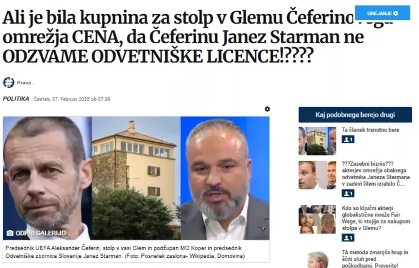 V člankih Ali je bila kupnina za stolp v Glemu cena, da Čeferinu Janez Štarman ne odvzame odvetniške licence? in »Zasebni biznis akterjev omrežja obalnega odvetnika Janeza Štarmana v zadevi Glem izrabilo Čeferina za svoje parkirišče?« smo analizirali, kako naj bi bil nakup stolpa del širšega politično-pravnega zavarovanja interesov določenih elit.