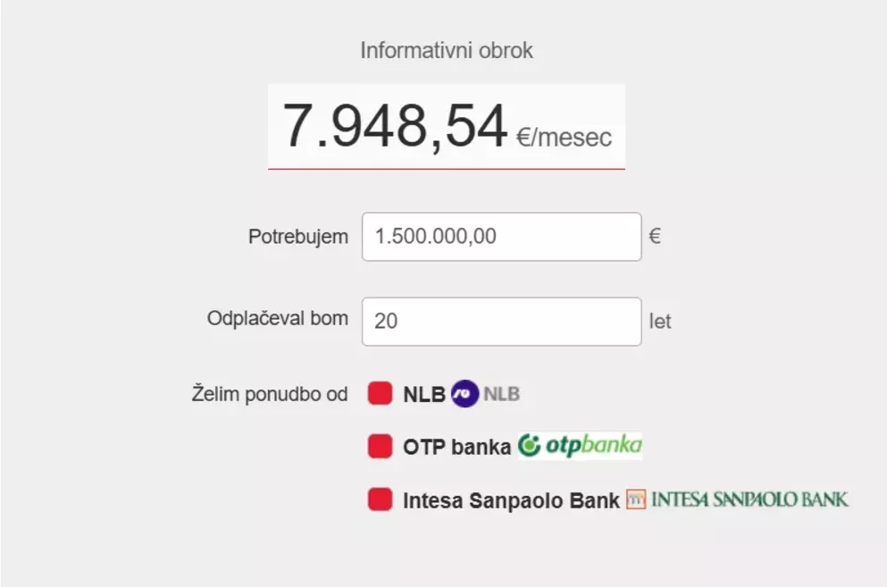 Izračun na spletni strani Nepremičnine.net, koliko bi plačevali na mesec, če bi za nakup stolpa v Glemu vzeli kredit za dobo dvajset let. (Foto: Posnetek zaslona-Nepremičnine.net)