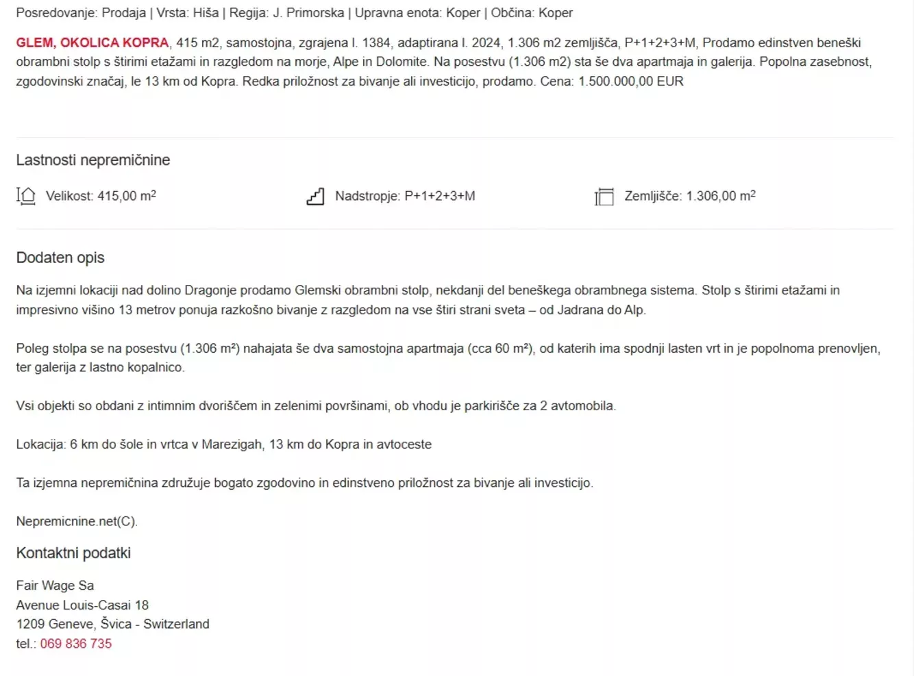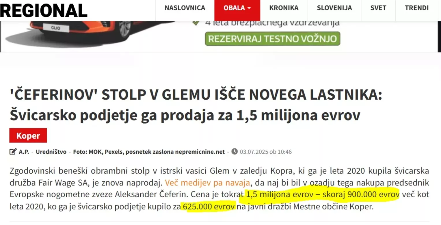 Ali zgodba beneškega stolpa v vasici Glem v Mestni občini Koper dobiva novo poglavje? Vse kaže, da sta zakonca Daniel Vaughan-Whitehead in Mira Celin Vaughan-Whitehead oziroma globalistična organizacija Fair Wage, pod formalnim zastopstvom Urše Zajc — žene Luke Zajca, dolgoletnega tesnega sodelavca in bližnjega sorodnika predsednika UEFA Aleksandra Čeferina — sprejeli odločitev, da bodo nepremičnino v vasici Glem prodali.Cena za nakup znamenitega beneškega stolpa znaša milijon in pol evrov.Na tem mestu pozivamo vse tiste premožne ljudi v državi, ki jih nima pod kontrolo ostanek koroškega #vzporednegamehanizma, obalni hirajoči ostanki neformalnega omrežja Komandos, akterji in operativci, povezani s podjetjem Splošna plovba Portorož, grobarski bančniški klan, ki mu poveljuje nepomemben mali državni uradnik z ekipo operativcev blizu Luke Koper, ter vzporedni rdeči kapital iz Češke, Republike Srbske, Avstrije, Švice in še od drugod…Naj se ti posamezniki in podjetniki opogumijo, vložijo svoj denar in s tem uničijo t. i. parkiriščno operacijo stolpa v Glemu, s katero vsi zgoraj omenjeni akterji že leta zlorabljajo to nepremičnino za svoje prikrite igre. Če se to zgodi, se jim bo — brez dvoma — ZMEŠALO!