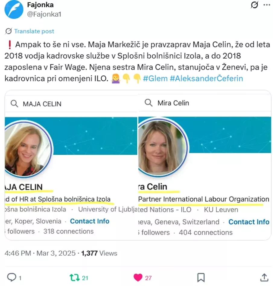Sestri Maja in Mira Celin. Maja Celin se je v preteklosti pisala Markežič in je bila zaposlena v organizaciji Fair Wage, zdaj deluje v kadrovski službi SB Izola. Mira Celin je uslužbenka IFO, s katero pogodbeno sodeluje njen mož, Daniel Vaughan Whitehead, ustanovitelj globalistične mreže Fair Wage.